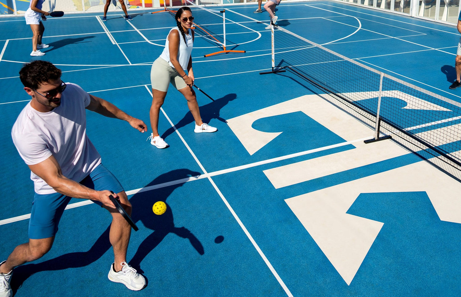 Utilizing the ship’s Sports Court—its multiple Pickleball courts offer picturesque ocean views and ample space to play.